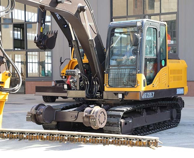 Escavadeira JG120LT de 12 toneladas para limpeza de lastro ferroviário e manutenção de trilhos.